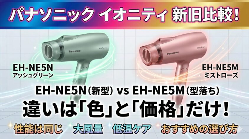 パナソニックの大風量ヘアドライヤー「イオニティ」、新型のEH-NE5Nと型落ちのEH-NE5Mの違いは「本体カラー」と「価格」の2点のみです。 機能や乾燥スピードといったスペックに違いは一切ありません。 比較項目新型 EH-NE5N型落ち EH-NE5M性能・風量まった... -