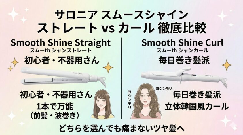 サロニアの新作「スムースシャインストレートヘアアイロン」と「スムースシャインカールヘアアイロン」。 どちらを買うべきか迷っている方へずばりお伝えすると、あなたの「求める仕上がり」と「ヘアアイロンへの慣れ(不器用さ)」で決まってきます。 も... -