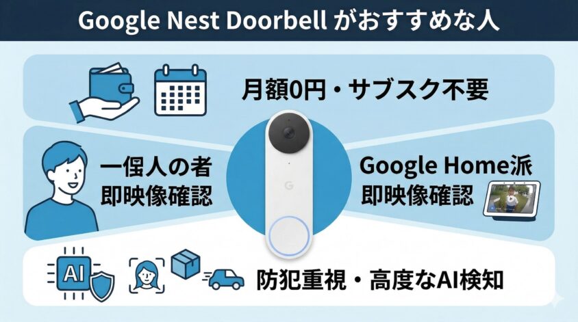 | Google Nest Doorbell | サブスク費用ゼロで使いたい方・Google Home派の方 |