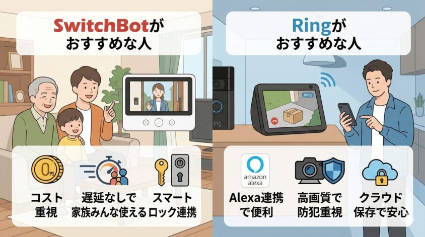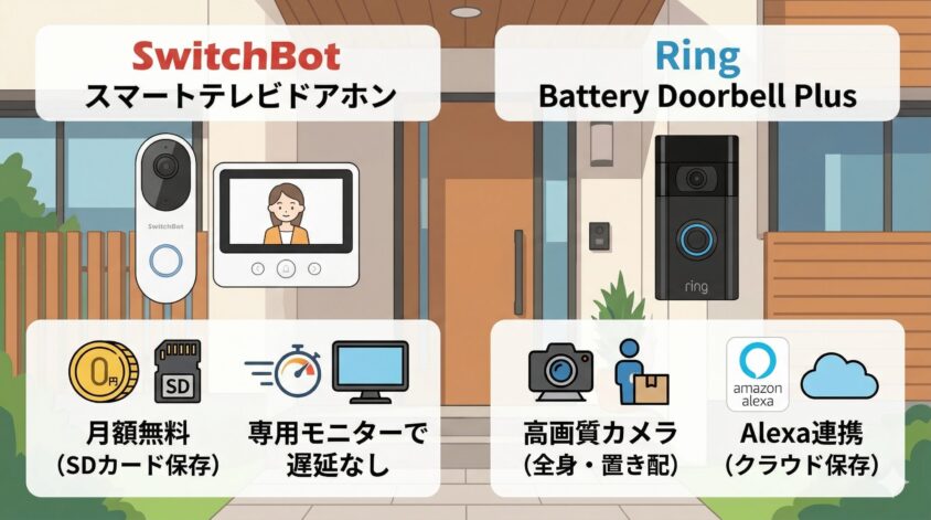 玄関の防犯や置き配の確認に便利なスマートドアホンですが、「月額無料で遅延なし」を求めるならSwitchBot、「防犯能力とAlexa(アレクサ)連携」を求めるならRingを選ぶのがおすすめです。