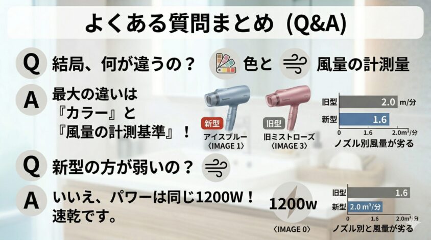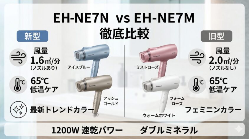 パナソニックのイオニティで迷ったとき、EH-NE7NとEH-NE7Mの違いを徹底比較すると、一番のポイントは風量の計測方法と本体のカラーバリエーションにあります。