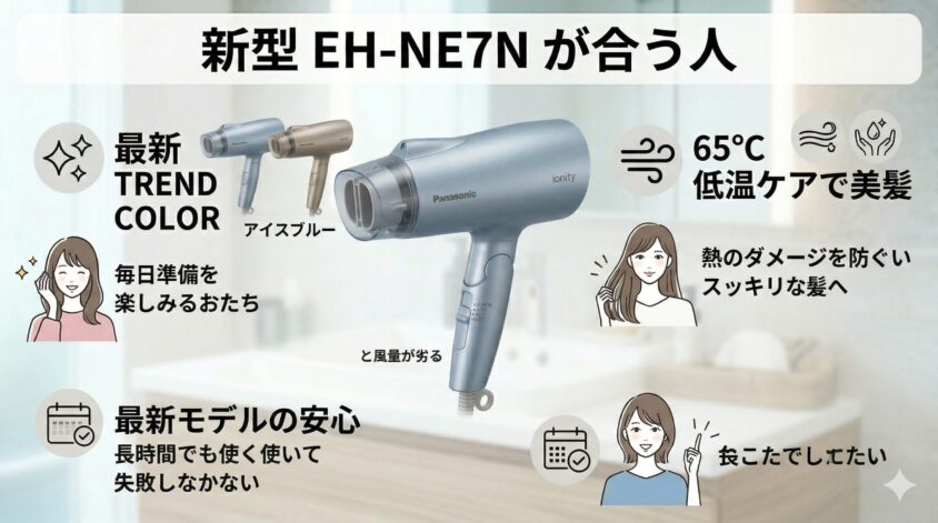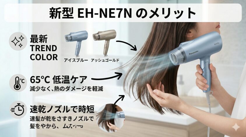 新型EH-NE7Nは、毎日の面倒なドライヤー時間を短縮しつつ、熱ダメージをしっかり防ぎたい人にぴったりなドライヤーです。