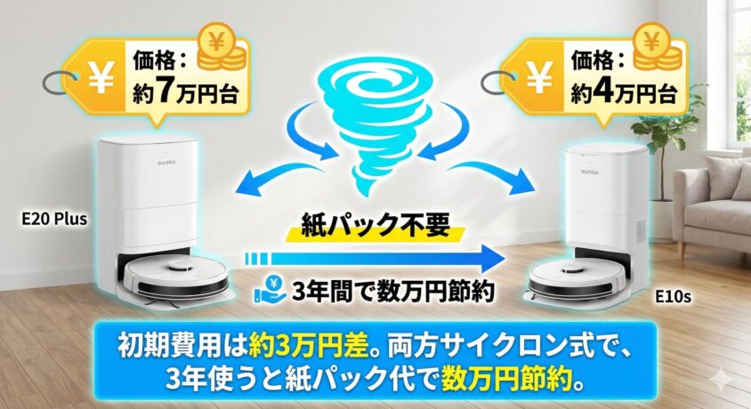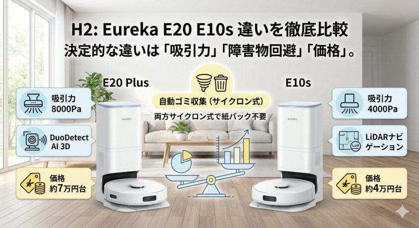Eureka E20 E10s 違いの決定的なポイントは、吸引力や障害物回避の性能、そして本体価格です。