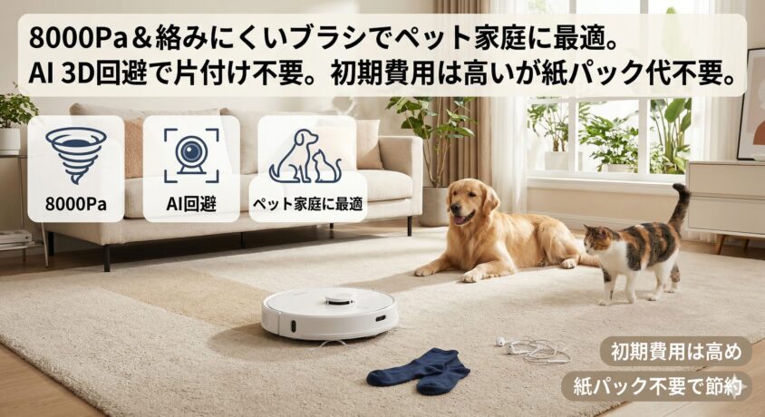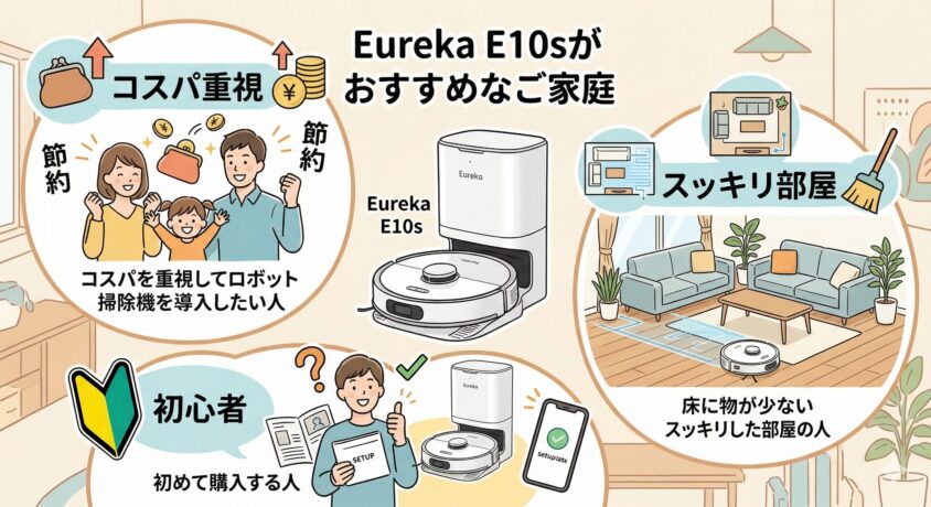 Eureka E10sがおすすめなご家庭は、「コスパを重視しつつ、自動ゴミ収集や水拭きの便利さを手に入れたい方」です。