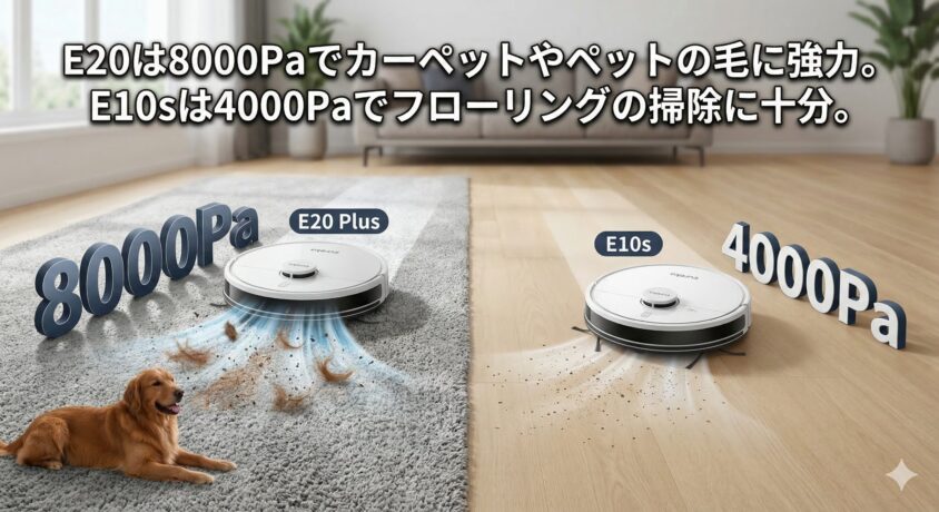 - ペットの抜け毛やカーペットの奥のゴミには、8000PaのE20 Plusが向いている