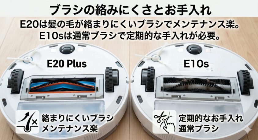 髪の長いご家族がいる場合や、ペットの抜け毛が多い環境では、E20 Plusの絡まりにくいブラシがメンテナンスの時間を大幅に減らしてくれます。