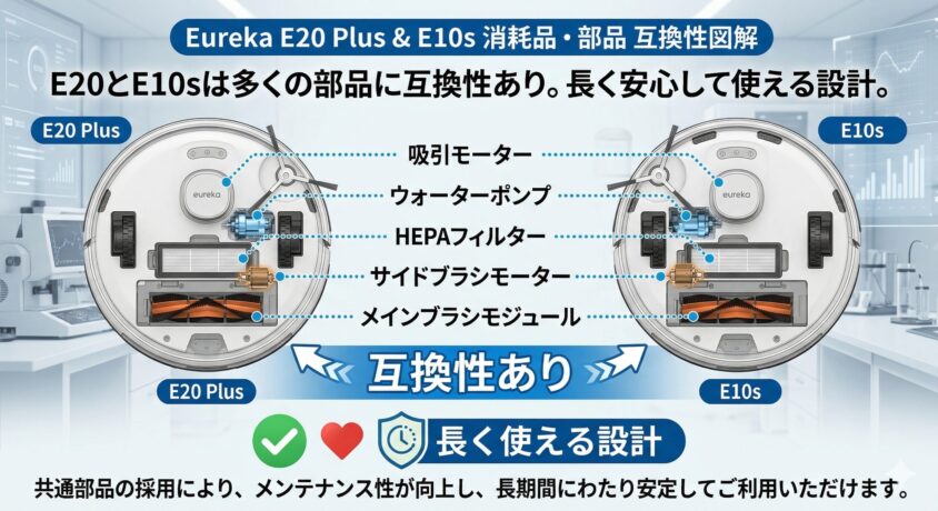 長くロボット掃除機を使い続ける上で気になる部品の交換ですが、実はE20 PlusとE10sは多くの物理的な部品に互換性があります。