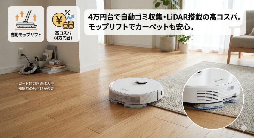 約4万円台という価格でありながら、自動ゴミ収集ができるベースステーションや水拭き機能がしっかりと搭載されています。