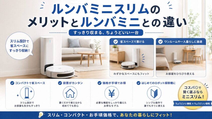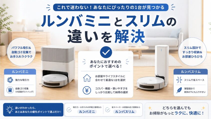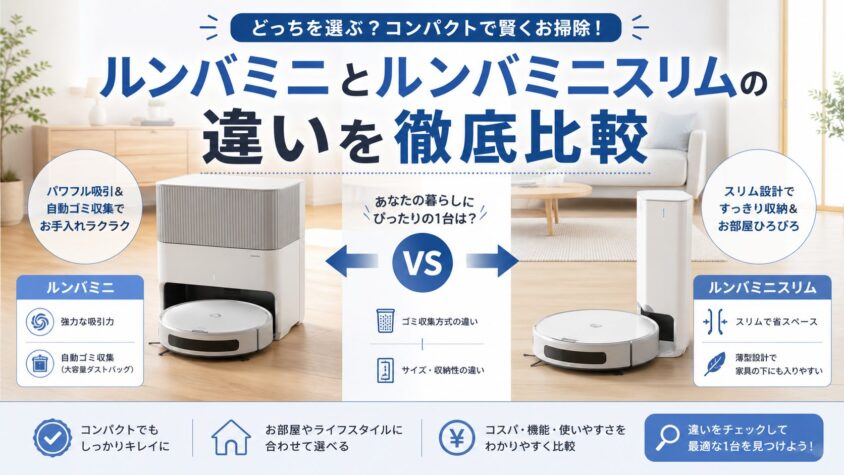 ルンバミニとルンバミニスリムの違いを比較してきましたが、結論として、家事の手間を極限まで減らしたい人はルンバミニ、安さと省スペース性を最優先する人はルンバミニスリムを選ぶのが正解です。