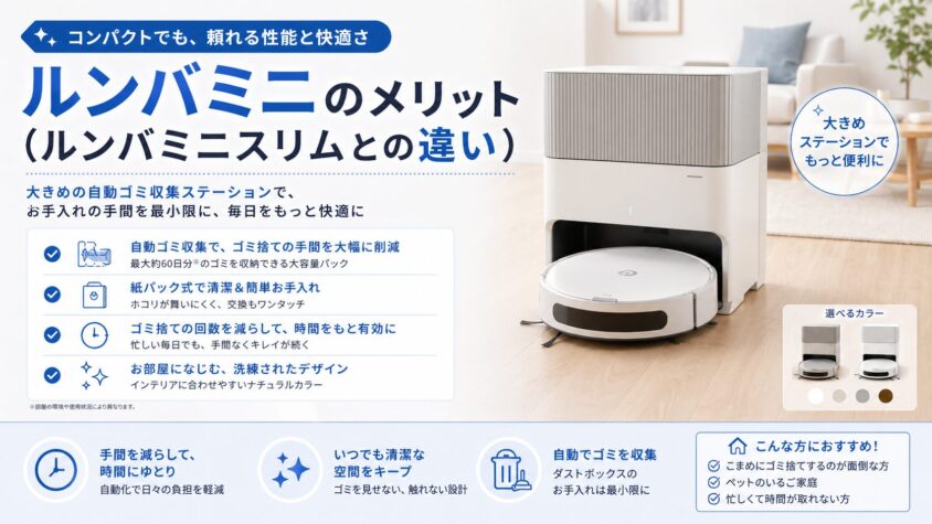 ルンバミニとルンバミニスリムの違いを比べたとき、ルンバミニを選ぶ最大のメリットは「掃除にかける時間を極限まで減らせる」ことです。