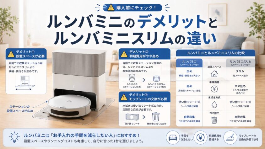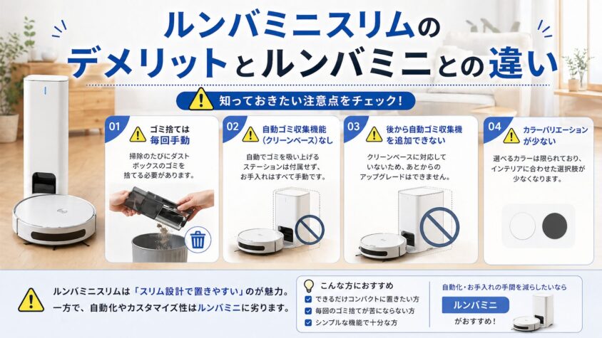 ルンバミニスリムを買ったあとに「やっぱり自動ゴミ収集機能が欲しい」と思ってもステーションの後付け不可なので、ご自身の性格が「究極の面倒くさがり」だと感じるなら、迷わずルンバミニを選ぶのが大正解です。