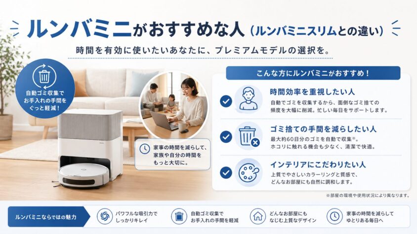 ルンバミニとルンバミニスリムの違いをすべて比較した結果、ルンバミニを選ぶべきなのは「家事にかかる時間を極限まで削りたい、タイパ(タイムパフォーマンス)重視の人」です。