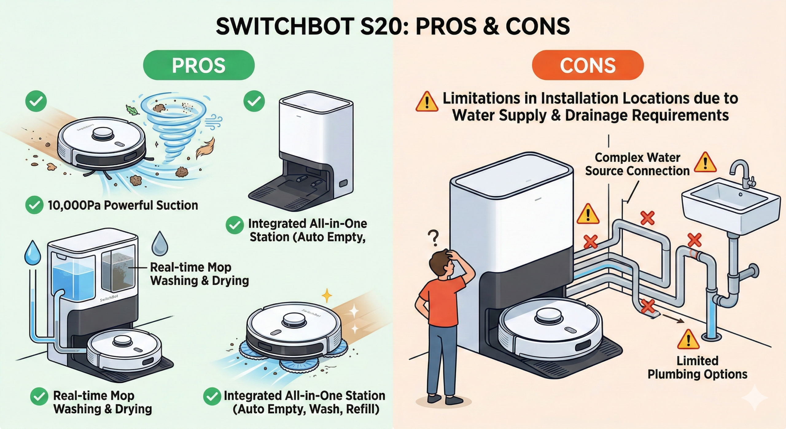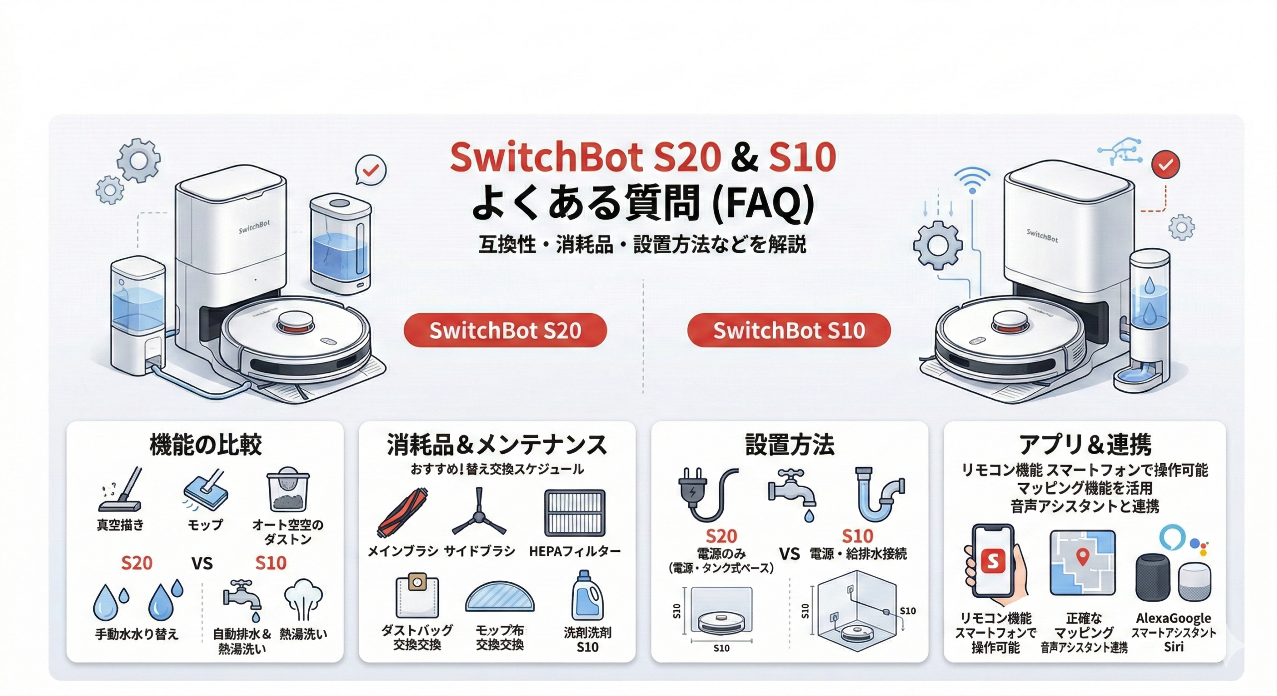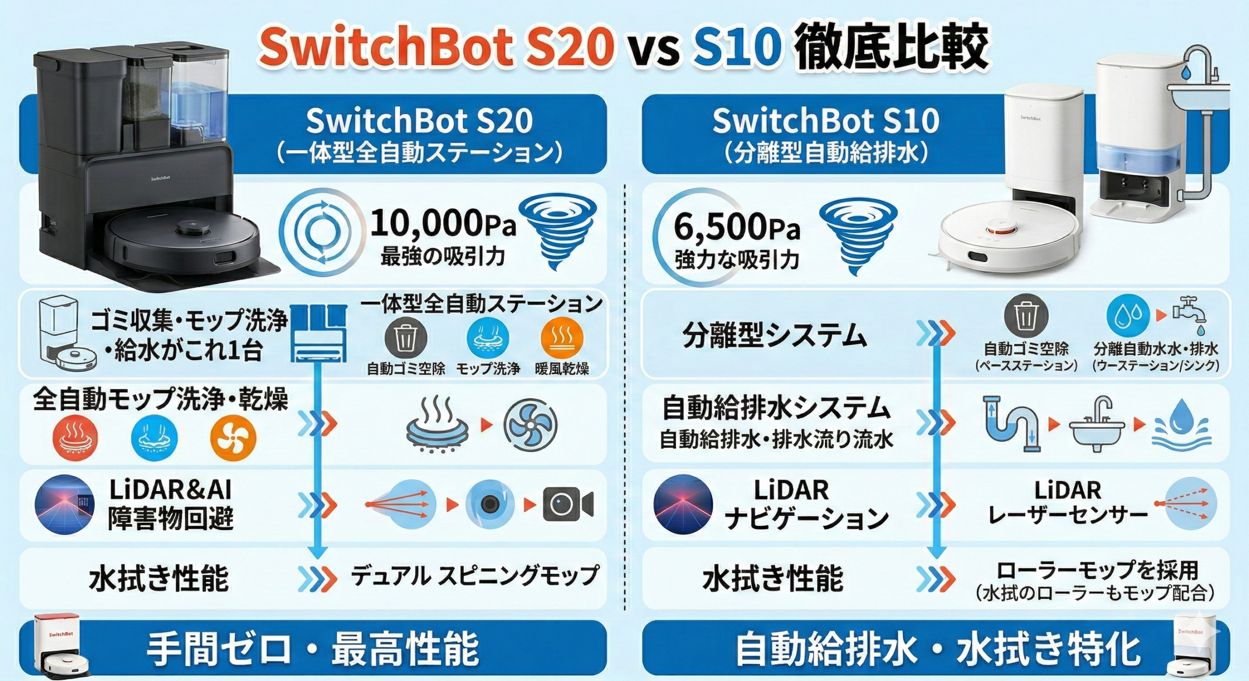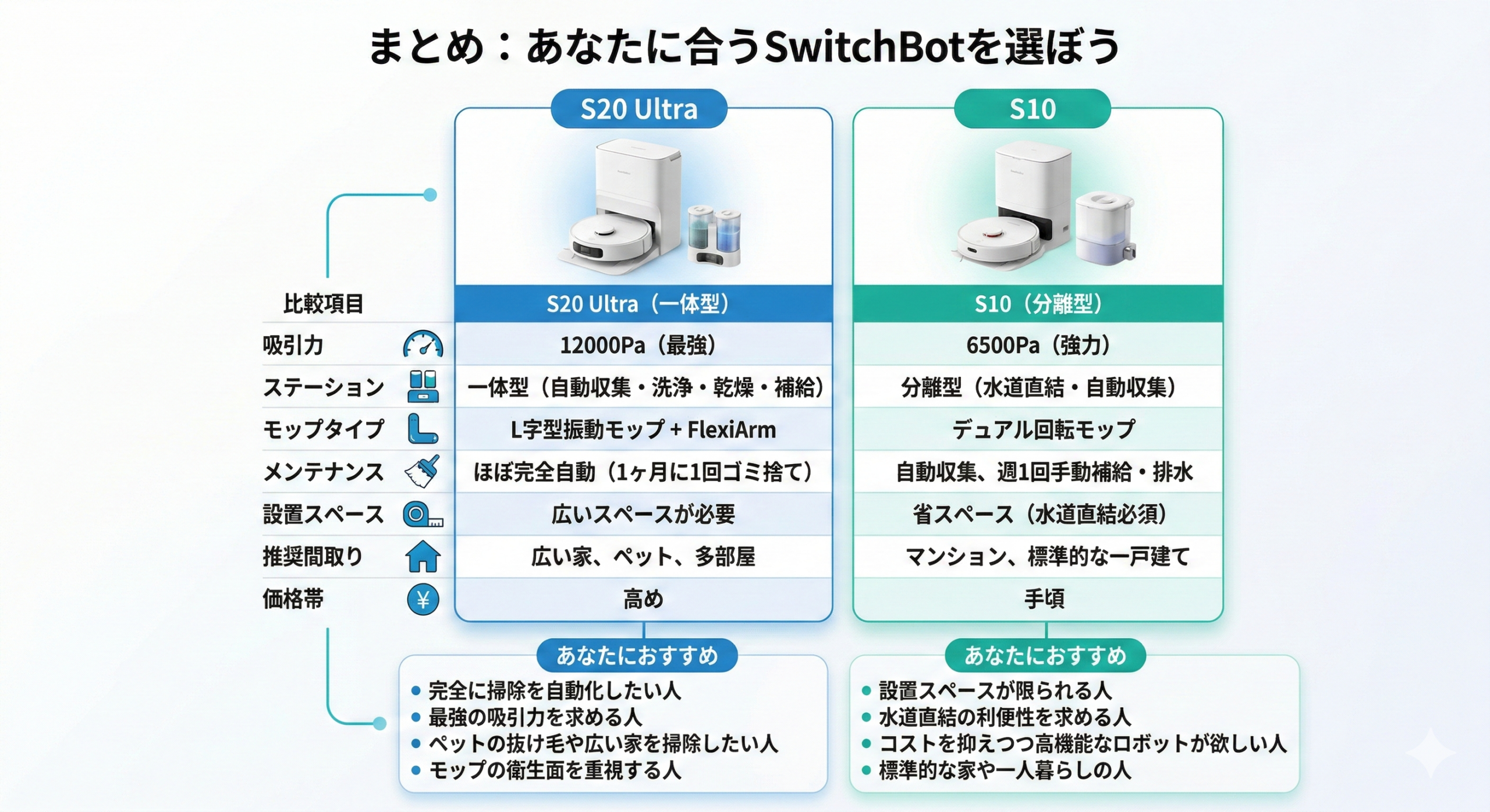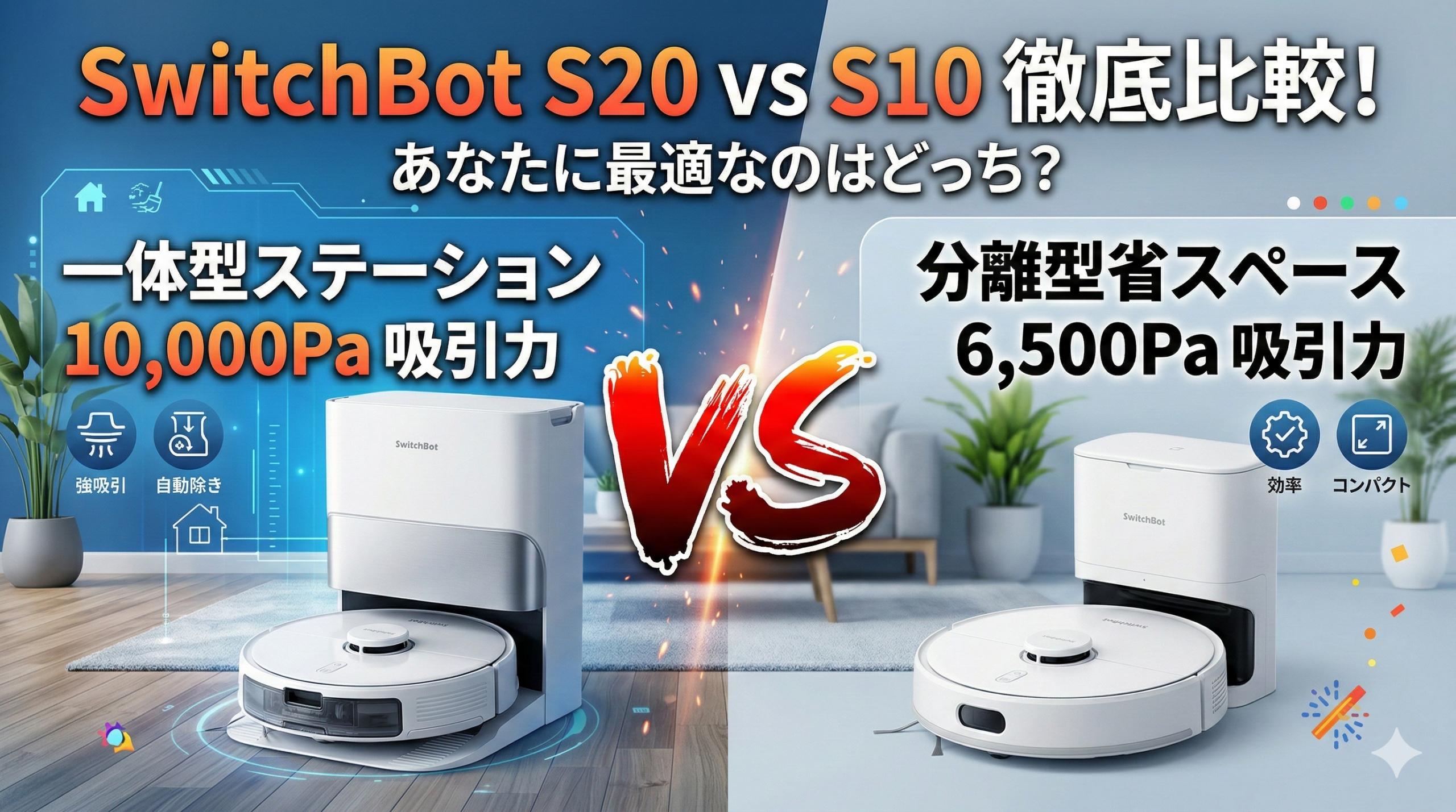 SwitchBot S20とS10の違いについて、ステーション構造・吸引力・設置スペース・コスト・アクセサリー互換性の5つの観点から詳しく比較してきました。