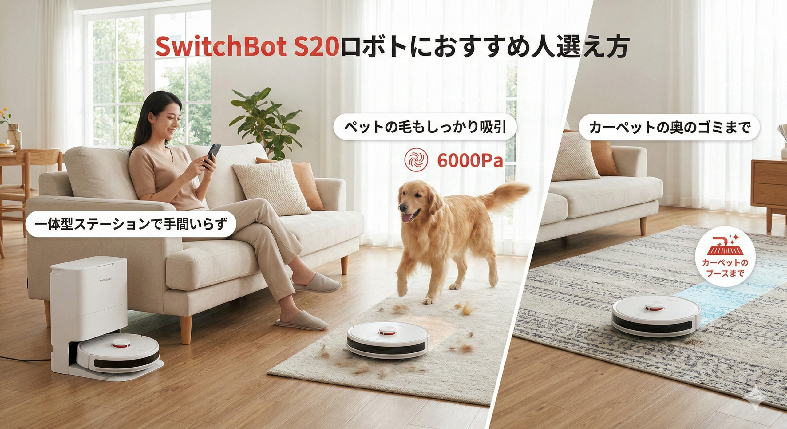 ステーションが一体化してスッキリ置ける点や、ペットの抜け毛も逃さない強力な吸引力を求めるなら、SwitchBot S20を選んでください。