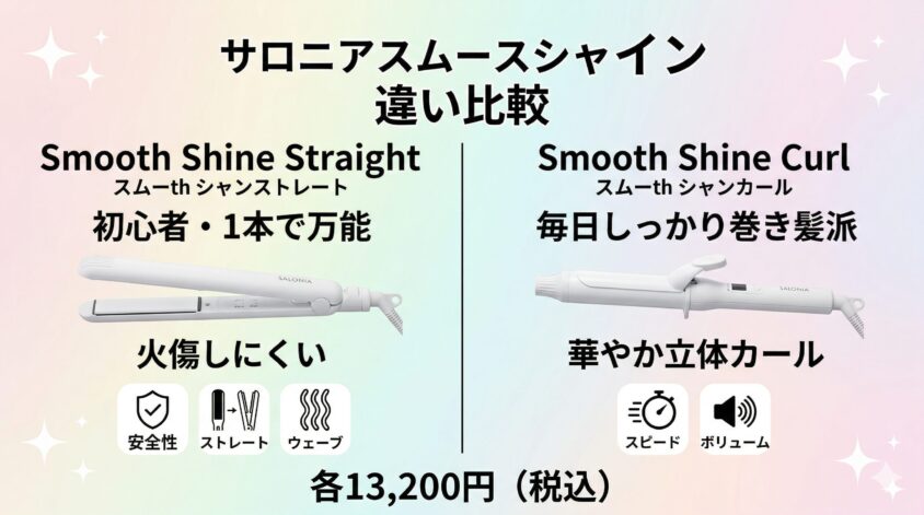 サロニアの新作「スムースシャインストレートヘアアイロン」と「スムースシャインカールヘアアイロン」の違いは、価格は同じ13,200円ですが、本体の形状と得意なスタイリングに明確な違いがあります。