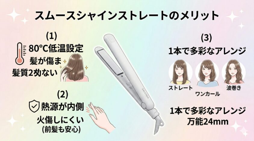 サロニアの「スムースシャインストレートヘアアイロン」と「スムースシャインカールヘアアイロン」の違いで迷っているなら、まずはストレートアイロンのメリットに目を向けてみてください。
