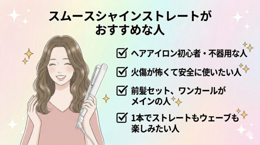結論として、どちらも毎日使っても髪が痛まない素晴らしい美容家電ですが、もし購入を迷っているなら、火傷の心配がなく1本で何役もこなせるスムースシャインストレートヘアアイロンを選ぶのが最も失敗しない選択です。