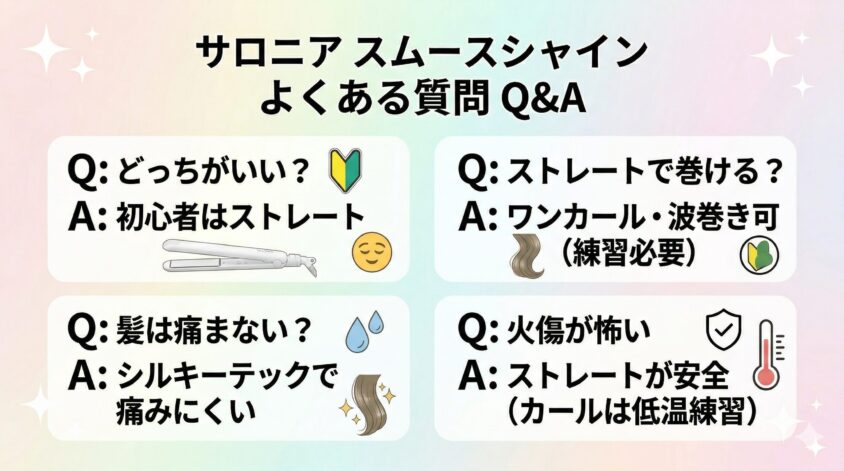 サロニアの「スムースシャインストレートヘアアイロン」と「スムースシャインカールヘアアイロン」の違いについて、購入前に検索されることが多いよくある質問をまとめました。