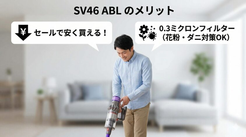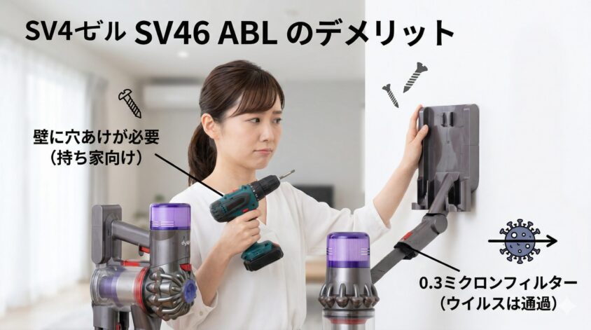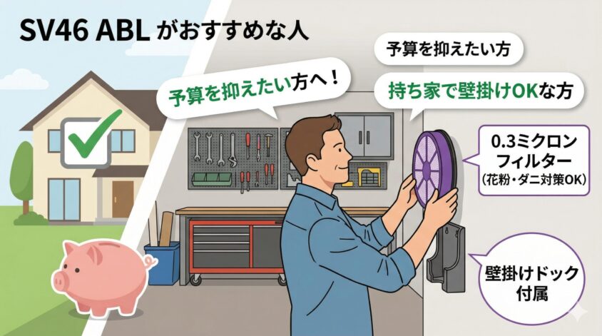 逆に、そこまでのフィルター性能は求めず、壁掛け収納ができる持ち家の読者さんなら、通常版の「SV46 ABL」を選んで価格差を節約するのが賢いお買い物です。