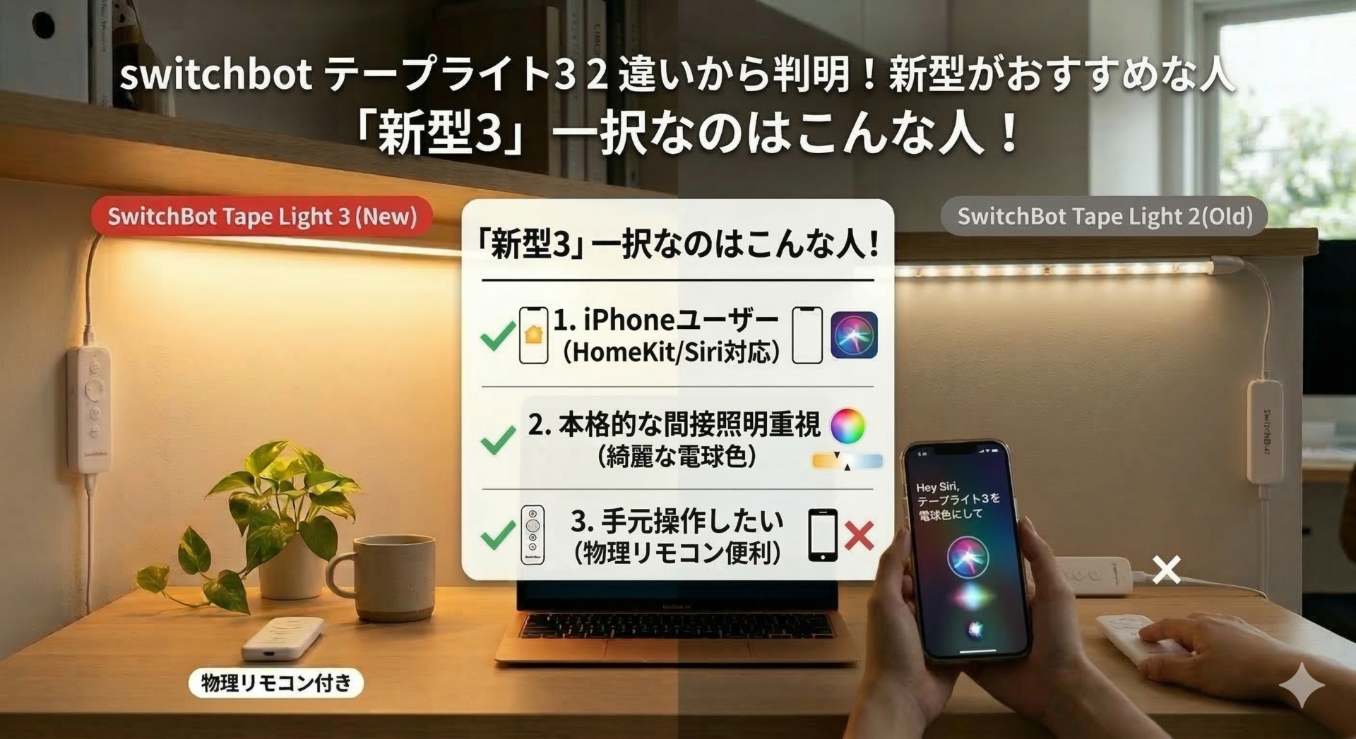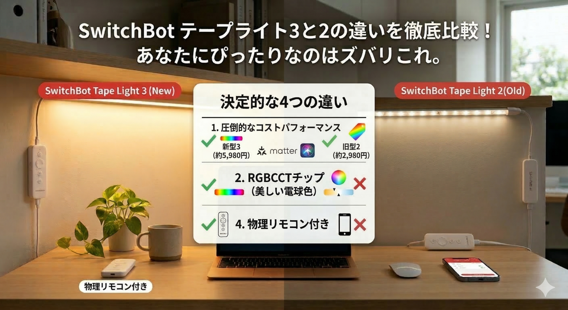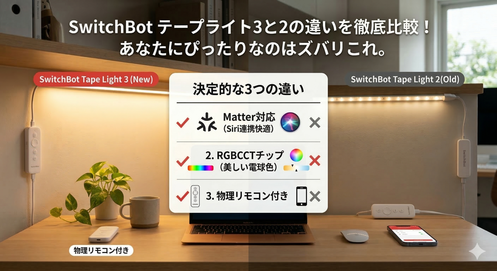 SwitchBotテープライト3と2の最大の違いは、「Matter対応によるApple HomeKit連携」「RGBCCTチップ採用による美しい電球色」「物理リモコンの有無」の3点です。