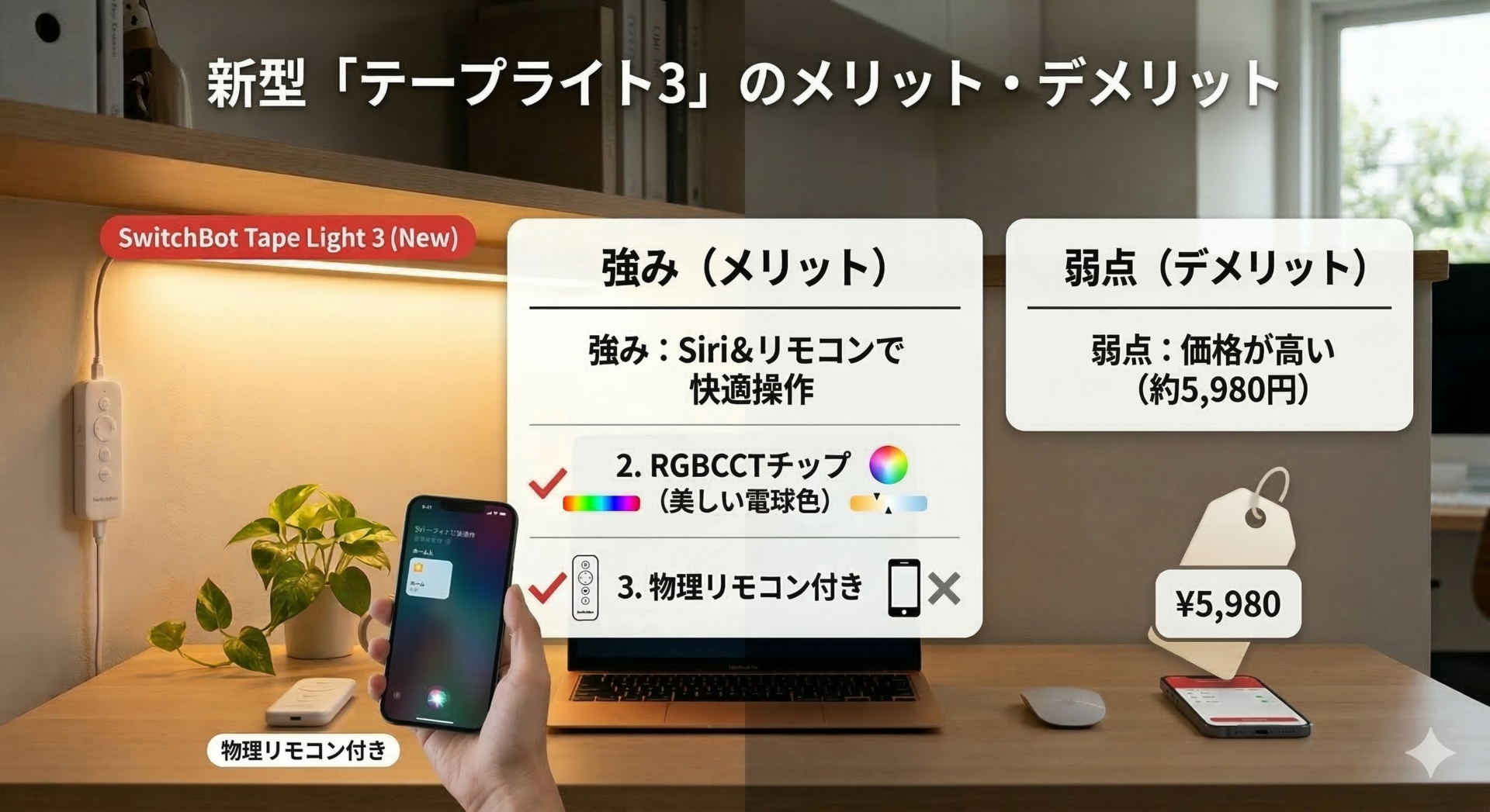 SwitchBotテープライト3と2の違いを踏まえて、ここでは新型であるテープライト3の具体的なメリットとデメリットをまとめます。