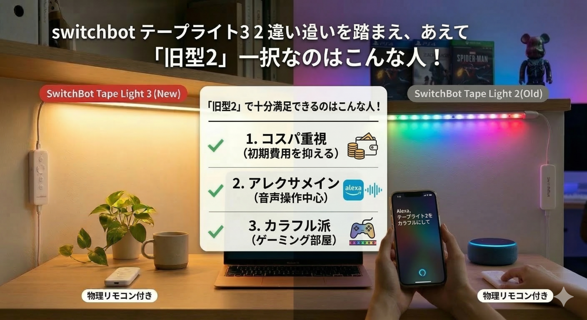 「switchbot テープライト3 2 違い」を比較すると、どうしても多機能な新型に目が行きがちですが、全員に新型が必要なわけではありません。