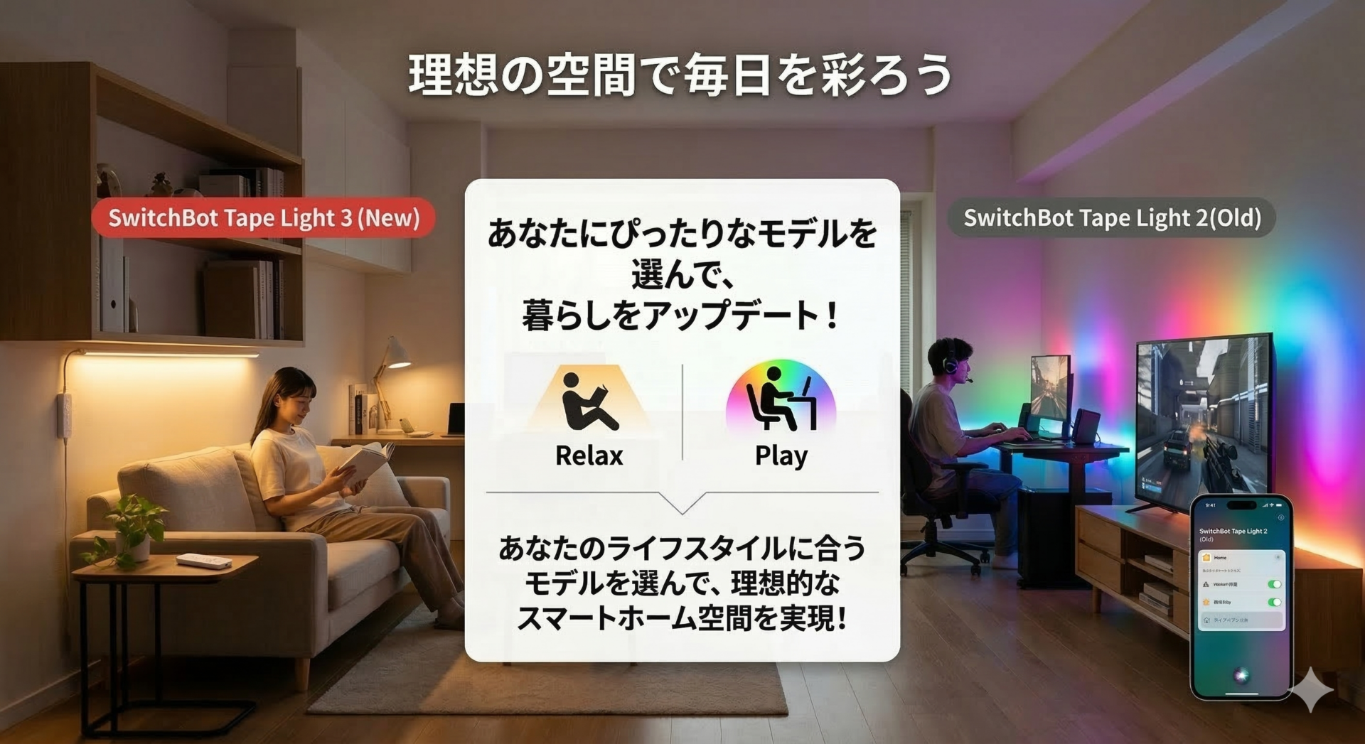 「switchbot テープライト3 2 違い」をじっくり比較してきましたが、機能の差を考えると、新型のテープライト3は特定のライフスタイルを持つ方にドンピシャでハマります。